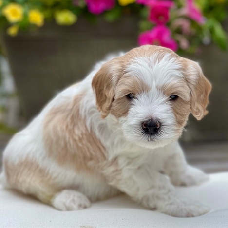 Sofie has an elegant body structure and a silky apricot fleece coat with tuxedo white markings; she is right between a large mini and a small medium in size. She is a gentle and loving girl who loves people and is just as happy to be running outside as she is cuddling for quiet time.